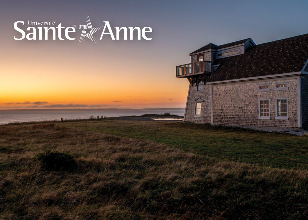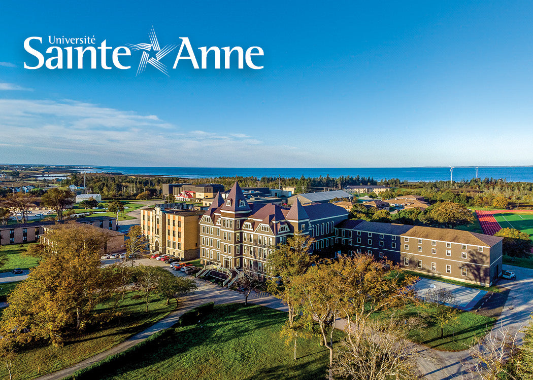 - Vue aérienne de l’Université Sainte-Anne avec son bâtiment principal, entouré de verdure et de l’océan en arrière-plan.