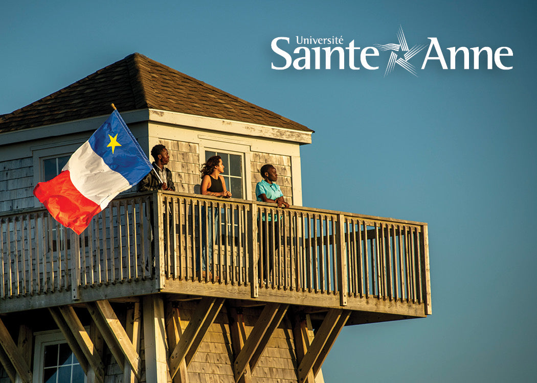 - Trois personnes sur le phare l’Université Sainte-Anne, avec le drapeau acadien flottant au vent sous un ciel bleu clair.