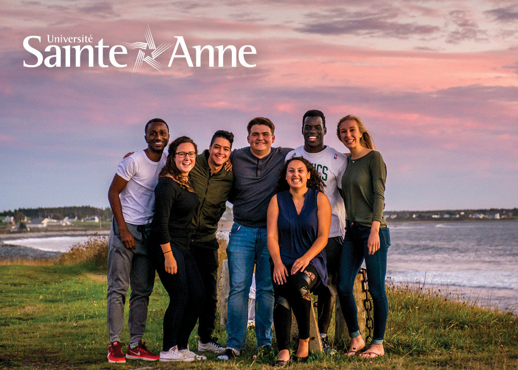 Un groupe d’étudiants souriants de l’Université Sainte-Anne réunis au bord de l’océan, sous un magnifique ciel au coucher du soleil.